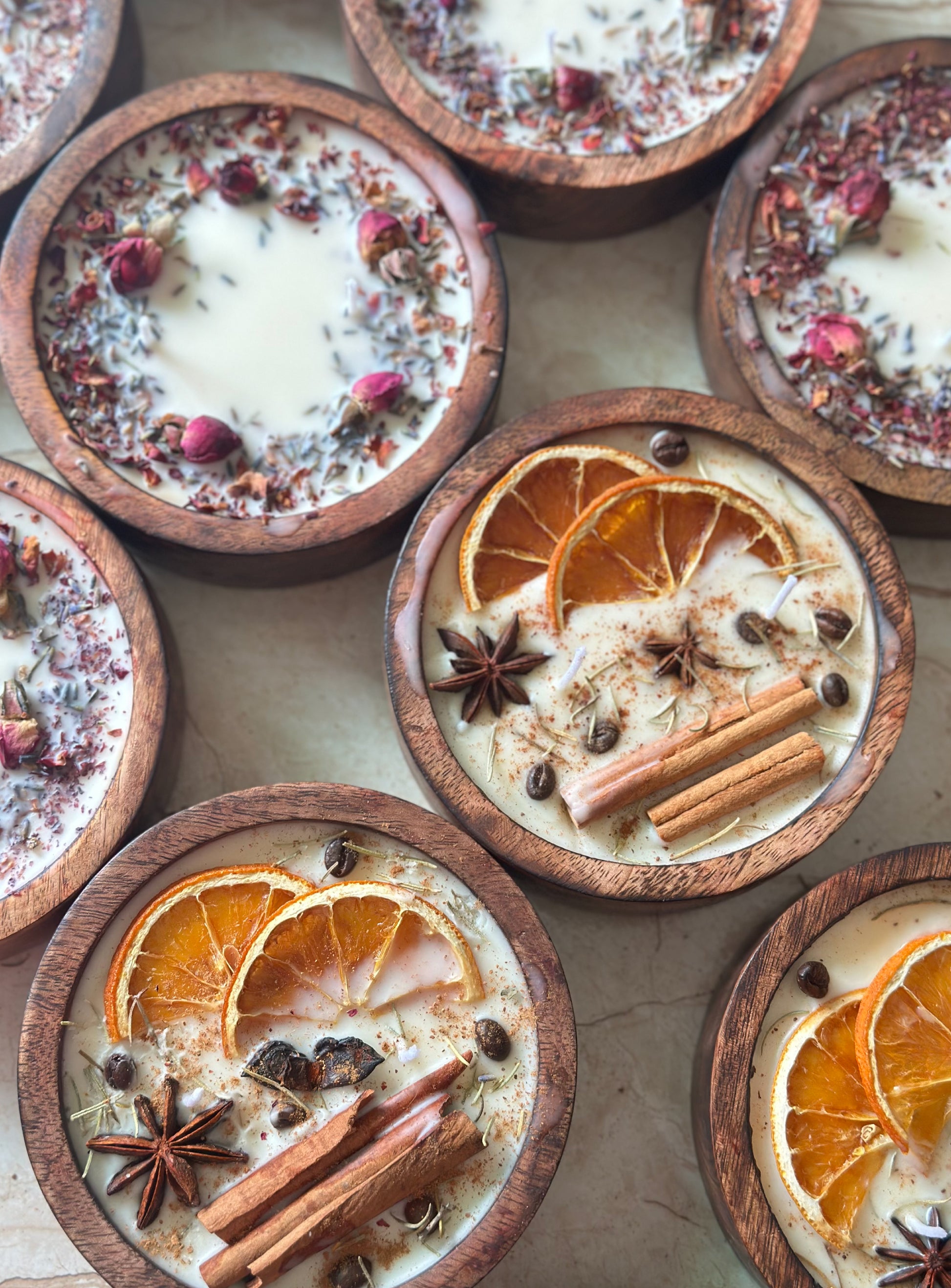 Crafted in natural wooden bowls, each candle is a rustic piece of art — blending botanicals, fragrance, and timeless design.